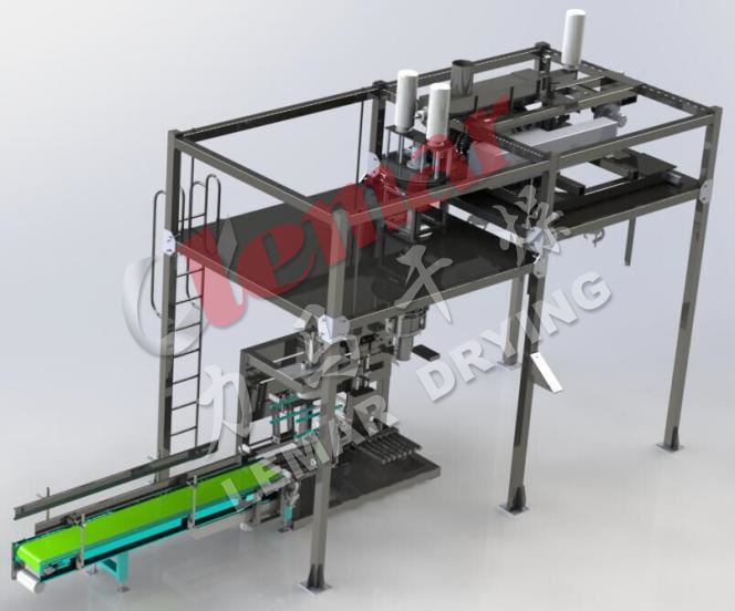 系統(tǒng)由雙向分料螺旋通過變頻控制為為大、小包裝供料。大包裝采用垂直加料螺旋喂料,集成高低速加料、電動升降、抖包、空袋吹氣、全密封夾袋器等裝置,有效解決包裝速度及精度要求,緩釋技術(shù)防止落袋揚(yáng)塵;小包裝包含分散破拱料斗、加料集成裝置、垂直喂料機(jī)構(gòu)、升降夾袋裝置、浮動關(guān)料閥門、稱重裝置及電氣控制系統(tǒng)。保證其包裝速度和精度,改善稱重包裝時的粉塵污染問題。配套拖袋牽引脫氣系統(tǒng)、縫包貼邊熱合機(jī)在稱重加料完畢后實現(xiàn)滿袋的自動牽引并抽氣,熱合封口。金檢機(jī)、重檢機(jī)對已封口的滿袋物料進(jìn)行金屬檢測和重量檢測。